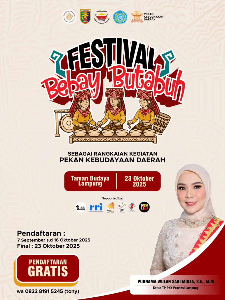 Bandar Lampung – Dalam rangkaian kegiatan Pekan Kebudayaan Daerah 2025, Dewan Kesenian Lampung bersama Pemerintah Provinsi Lampung menggelar Festival Bebay Butabuh yang akan diselenggarakan pada