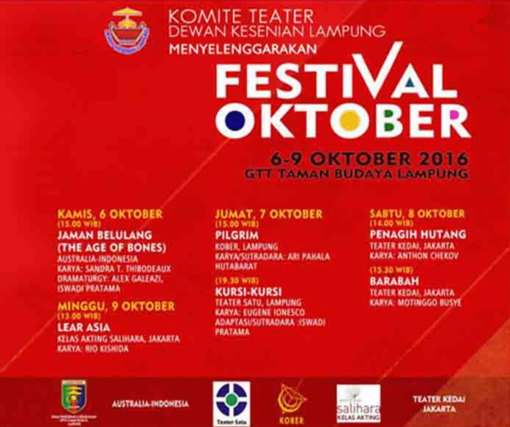 Bandar Lampung, 10 Oktober 2016 — Komite Teater Dewan Kesenian Lampung (DKL) sukses menggelar hajatan besar bertajuk “Festival Oktober” pada 6–9 Oktober 2016 di Gedung Teater Tertutup Taman Budaya Lampung, Jalan Cut Nyak Din, Bandar Lampung.